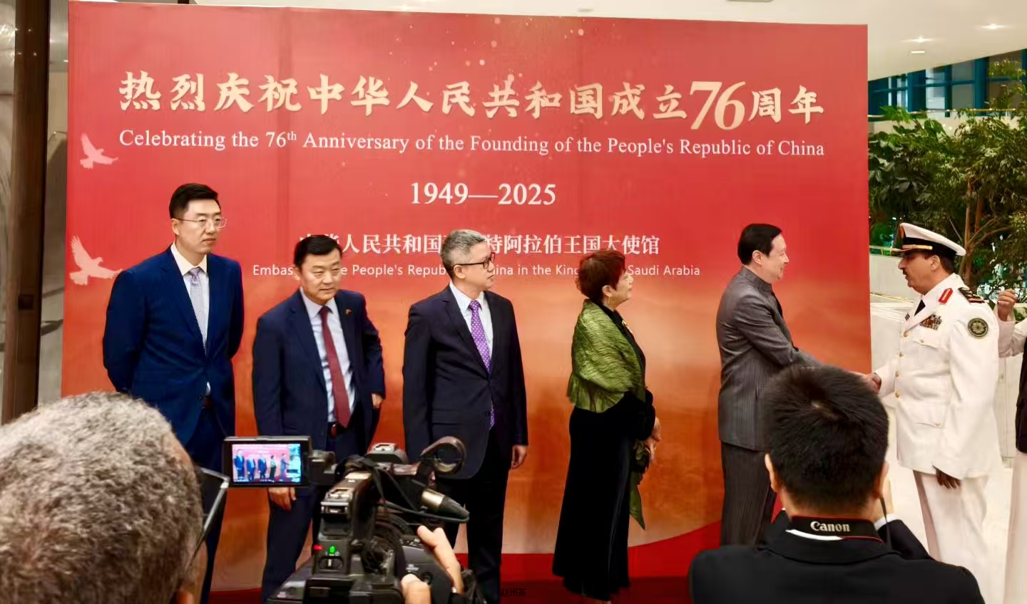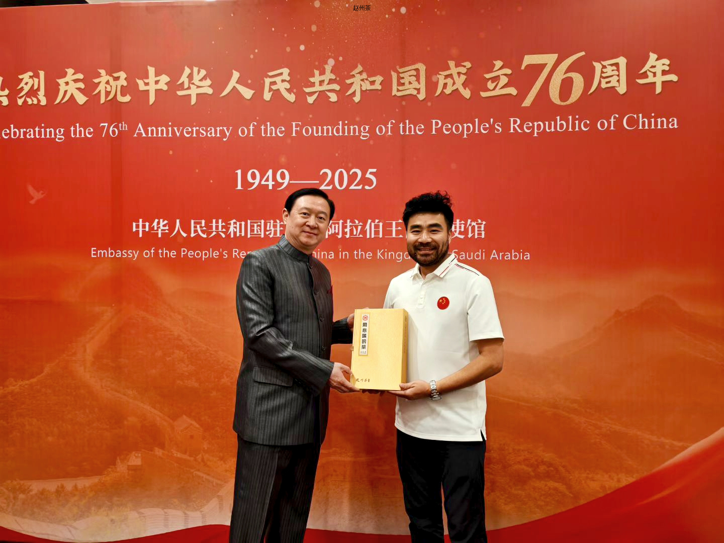 值得一提的是,活动恰逢中国驻沙特阿拉伯王国大使馆庆祝中华人民共和国成立76周年。在这个特殊的日子里,赵州茶以独特魅力架起中沙文化交流的桥梁,并以官方指定伴手礼及贵宾接待的贴心形式,为活动增添了别样的东方温情,常华大使亲自为赵州茶推广助力,与到场嘉宾共同合影留念,将这份跨越国界的茶香情谊定格为永恒。
